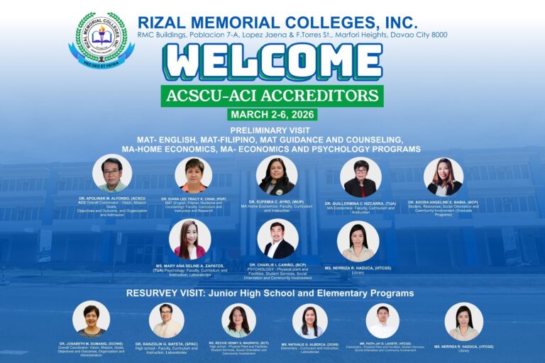 The Rizal Memorial Colleges community warmly welcomed the accreditors from ACSCU-ACI (Association of Christian Schools, Colleges and Universities – Accrediting Council, Inc.), whose visit serves as both an evaluation and an opportunity for growth. Faculty members, administrators, staff, and students came together in unity, reflecting a shared commitment to excellence and accountability in delivering quality education.