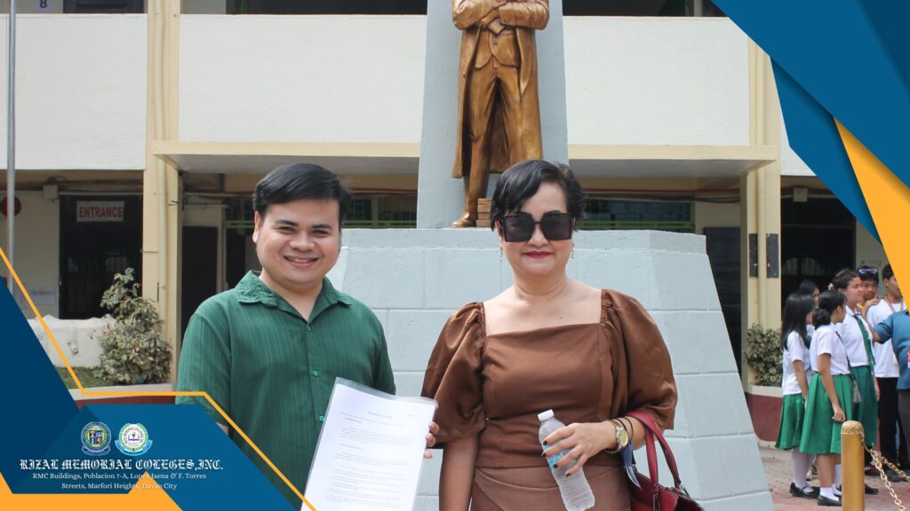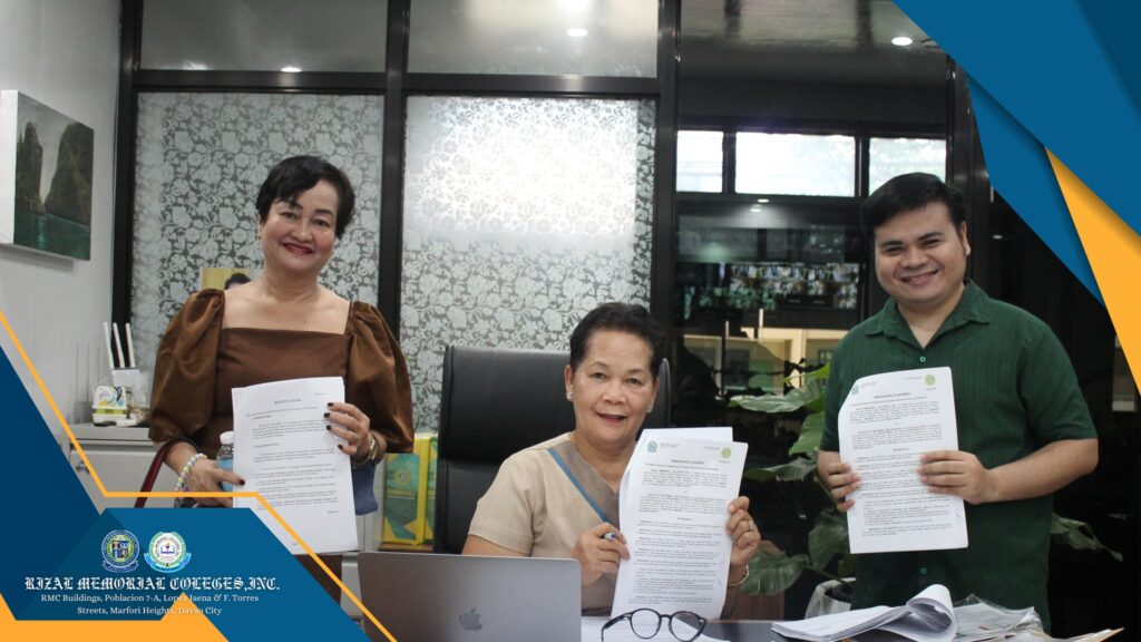 September 15, 2025 – The College of Teacher Education of Rizal Memorial Colleges, Inc. (RMC-CTE) officially signed a Memorandum of Understanding (MOU) with Davao City National High School (DCNHS). The MOU was represented by Dr. Agnes P. Mascariñas, Dean of the College of Teacher Education, together with Prof. Antonio A. Solomon Jr., Intern Supervisor, and Principal Evelyn E. Magno, Principal I of DCNHS.