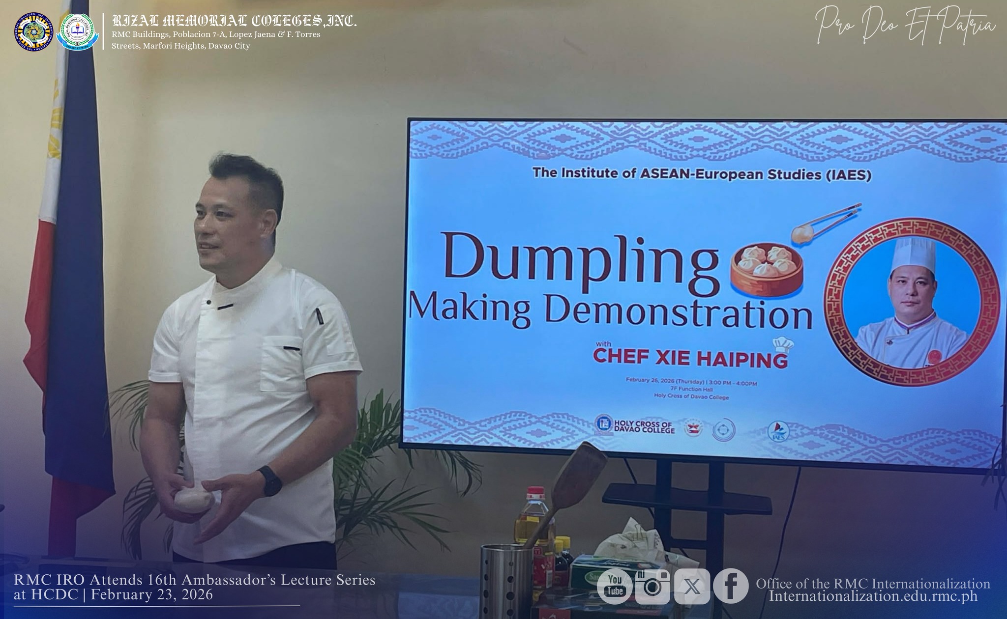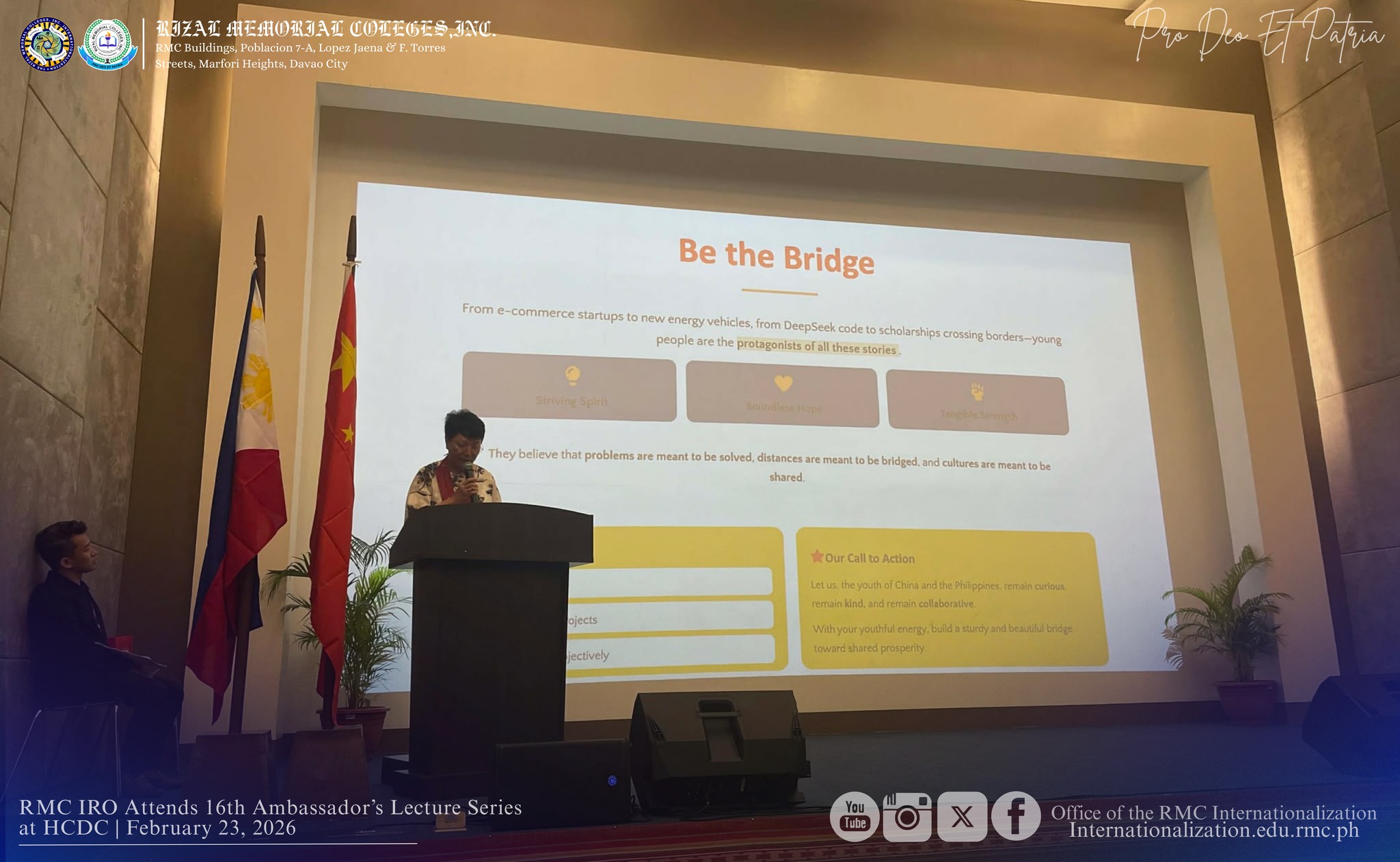 Rizal Memorial Colleges, Inc. (RMC) continues to strengthen its internationalization initiatives through active participation in high-level diplomatic and academic engagements. On February 26, 2026, Prof. Antonio A. Solomon Jr., representing the RMC Internationalization Office (IRO), attended the 16th Ambassador’s Lecture Series hosted by Holy Cross of Davao College (HCDC).
