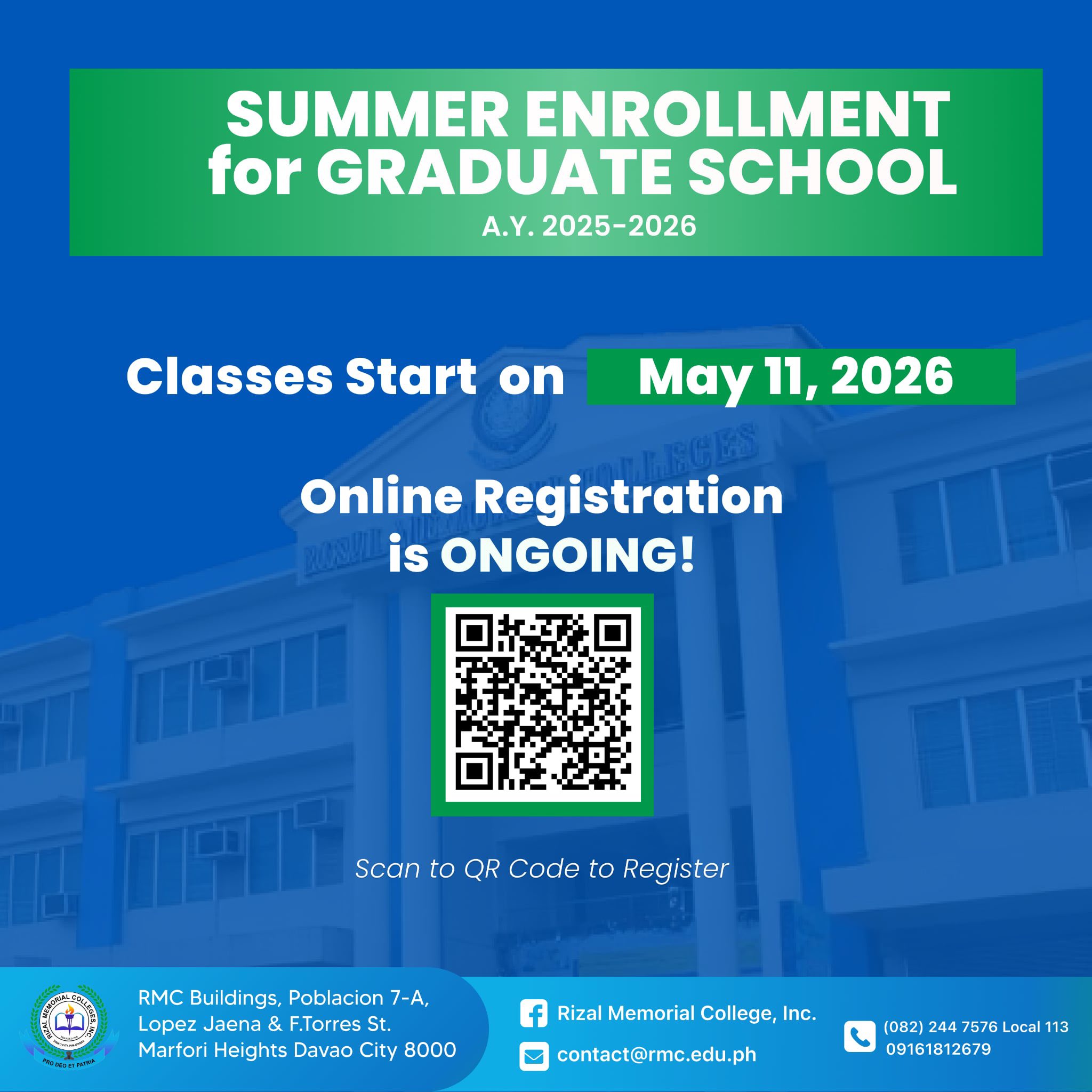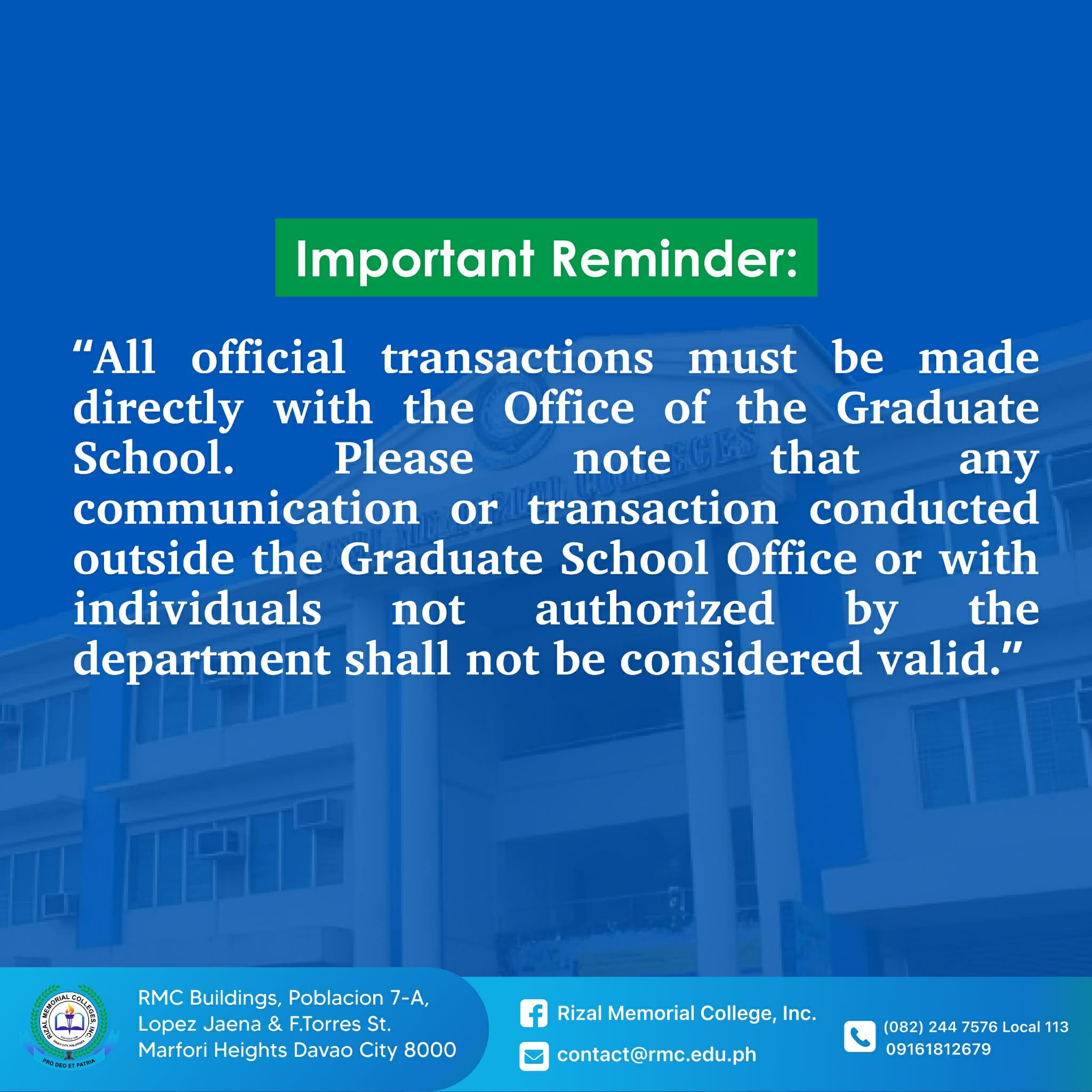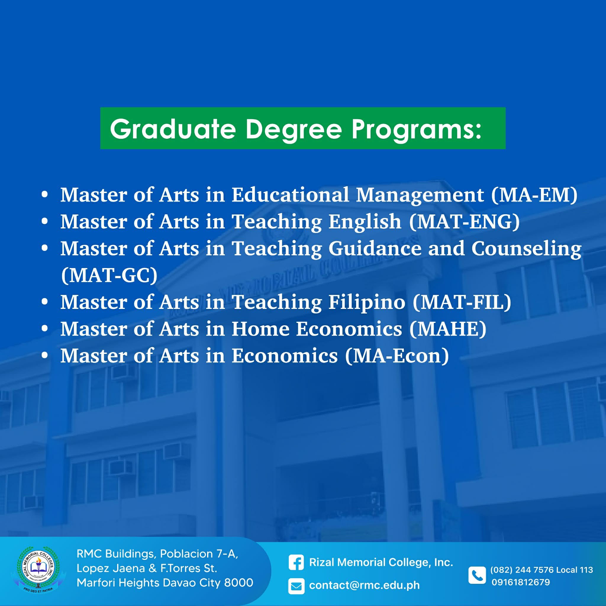 The Graduate School of Rizal Memorial Colleges, Inc. ushers in a renewed vision—driven by a commitment to academic excellence and dedicated to guiding you in achieving your goals.